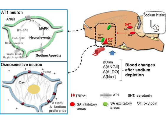 The main dysfunctions in sodium and body water balance are classically recognized as hyponatraemia and hypernatraemia because sodium is the ion determining the osmolarity of the extracellular fluid. Both disorders contribute to morbidity and mortality and are highly prevalent in critically ill patients. Hyponatraemia is recognized as the most common electrolyte disorder in clinical medicine. Epidemiological studies have indicated that hyponatraemia occurs in approximately 1-2% of hospitalized patients. In this regard, previous work by our and other laboratories has shown that hyponatraemia caused by acute body sodium depletion generates a state of hypovolaemia, which stimulates the renin angiotensin aldosterone system (RAAS). This system is one of the main corrective mechanisms, as it promotes renal sodium and water retention and stimulates water and sodium intake, known as thirst and sodium appetite respectively. However, it has been reported that there is a temporal dissociation between the fall in plasma natraemia/osmolarity and the onset of the corrective behavior, sodium appetite, which is stimulated with a latency of between 16 h to days depending on the model under study.