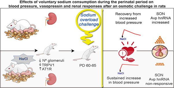 In contrast, states of hypernatremia and body hyperosmolarity are associated with the development of cardiovascular diseases such as hypertension in genetically predisposed individuals or kidney disease. There is a large consensus on the effect of habitual and excessive salt consumption in Western societies on blood pressure. It has also recently been shown that maternal sodium intake during the perinatal period is capable of determining and/or programming blood pressure regulation in the next generation. In this regard, our results, in an animal model, indicate that early exposure to a hypernatremic environment is able to alter in offspring during adulthood: -water and sodium intake; -salt preference; -the activity of various brain areas, -the synthesis of components of the vasopressin and angiotensin systems at the brain and renal level; and blood pressure regulation, in the face of various osmotic challenges.