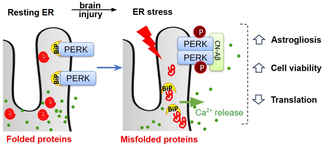 Durante procesos inflamatorios, la acumulación de proteínas mal plegadas en el retículo endoplásmico activa una respuesta adaptativa conocida como UPR, que permite restablecer la homeostasis celular y, cuando falla, puede conducir a la activación de vías apoptóticas. Nuestro grupo identificó y caracterizó un mecanismo de liberación de Ca2+ desde el retículo endoplásmico que activa la fase protectora de esta respuesta en astrocitos (Figura 1), mediante una señalización dependiente de calcineurina y PERK, asociada con modelos de inflamación e isquemia cerebral (Figura 2).